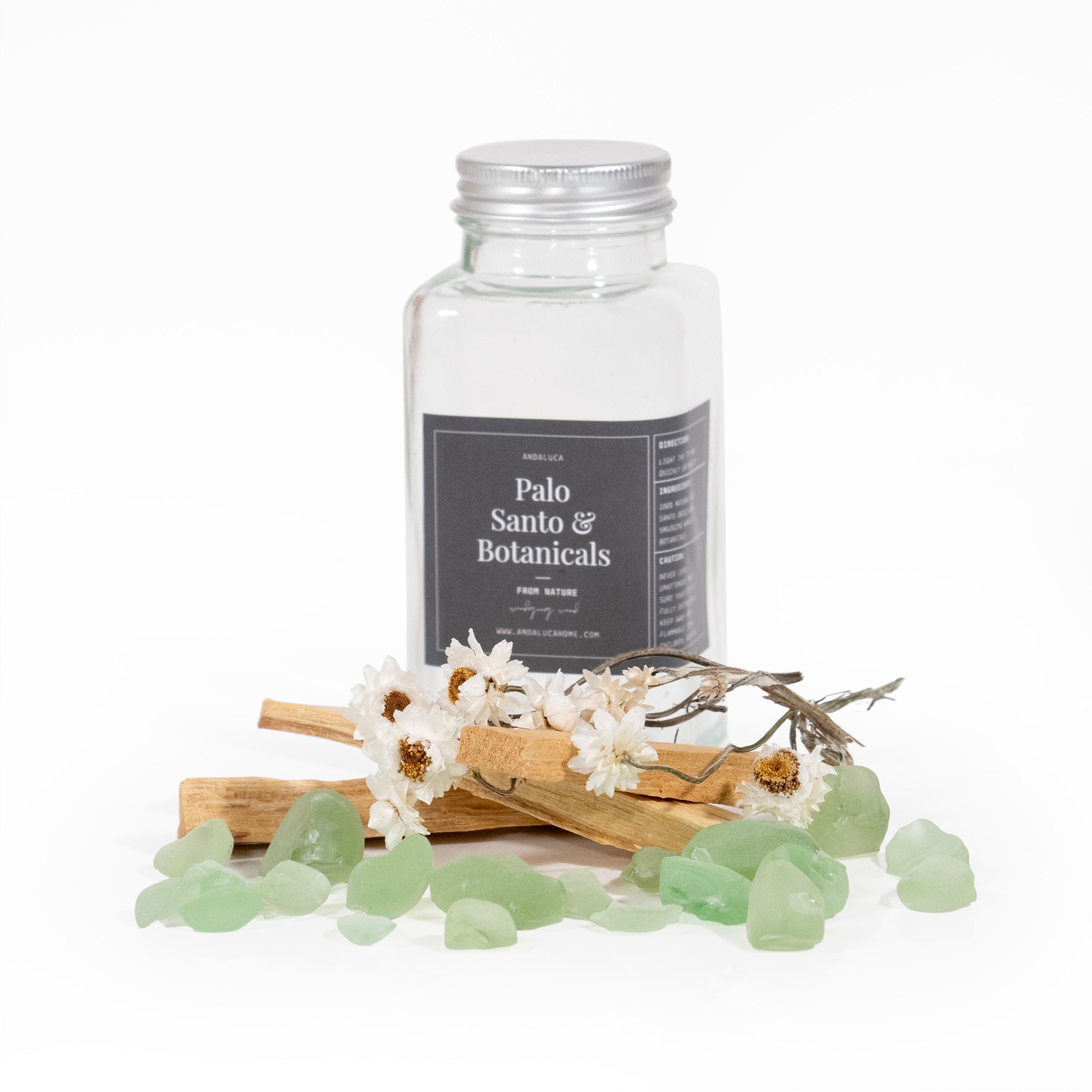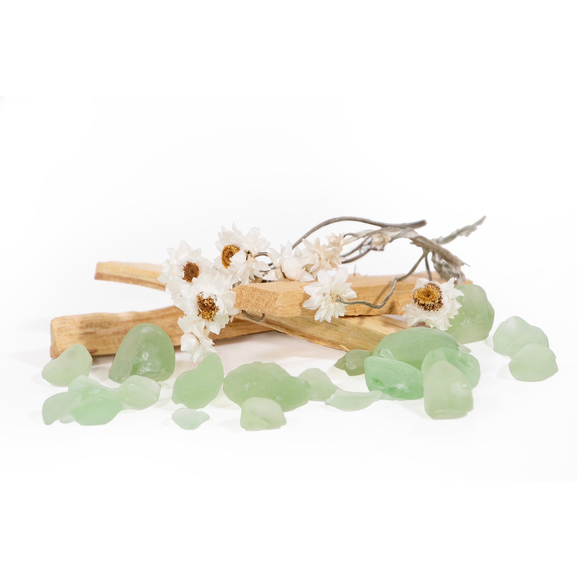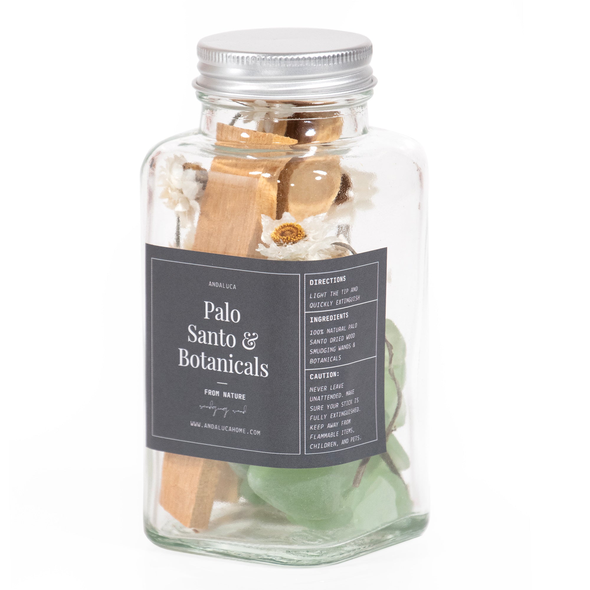 Our Palo Santo & Chamomile Smudging Jar Set contains palo santo harvested in Peru, and delicate dried chamomile flowers. We made this smudge kit to be both beautiful, simple and straight forward when you want to cleanse the energy of your spaces and including green quartz rocks in the base of the jar.